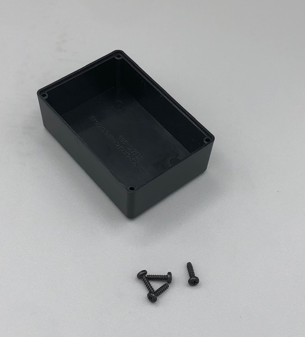 ABS enclosure, screw together, black, internal dimensions 0.87 x 0.57 x 0.35". 4 No. 2 self tapping assembly screw included. Screw bosses intrude into box 0.12 x 0.12" in each corner, wall thickness .07". Sold in Packs of 10 pcs.